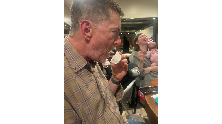 Friday night it was Benihana, which is our family birthday tradition. I didn’t want ice cream so they brought was looked like a little Pup Cup of whipped cream like you’d get at Caribou. So to be stupid, I licked it out of the cup like a dog.