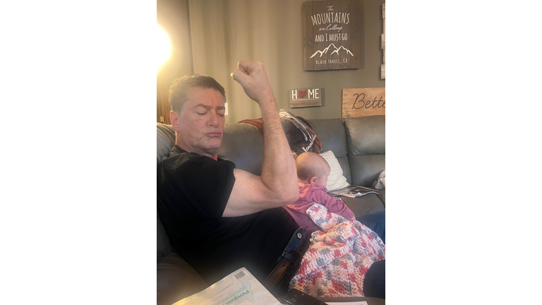 Sure, I am holding a cute baby, but take a look at those 21 inch biceps!