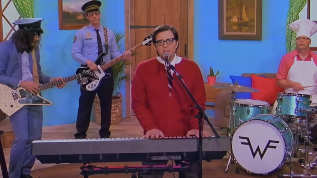 The first, "High as a Kite," sees Rivers Cuomo channeling his inner Mister Rogers, as he hosts a show called "Mister Rivers' Neighborhood," red cardigan and all. He and the rest of the band, dressed in various costumes from chef to police officer, play an uplifting, folky song to the audience, made up mostly of kids, but then things take a dark turn as the track shifts from soft to hard.