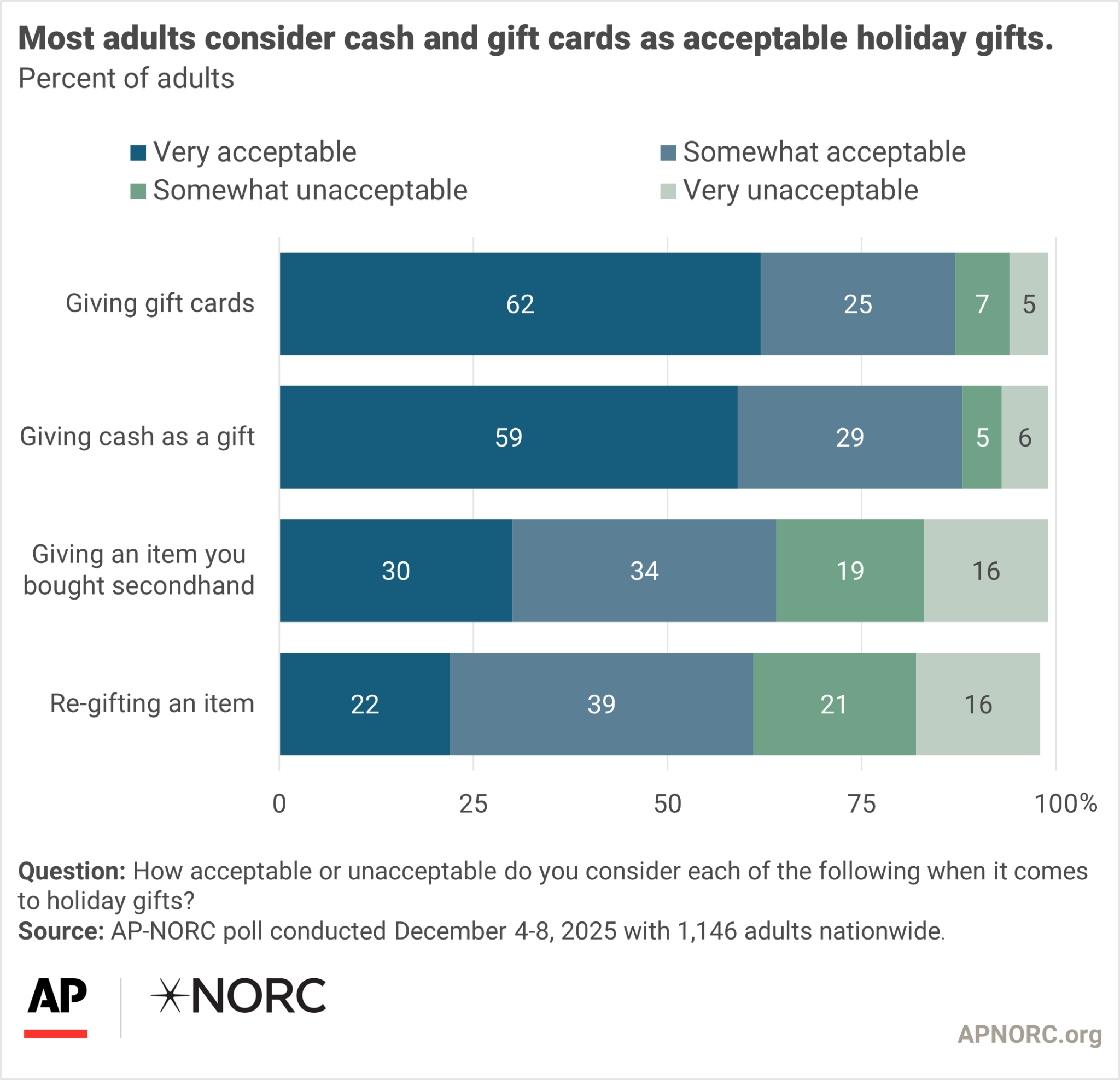 A new poll found most Americans think regifting is acceptable now: 61% said it's at least "somewhat" okay. That includes 22% who said it's totally fine.